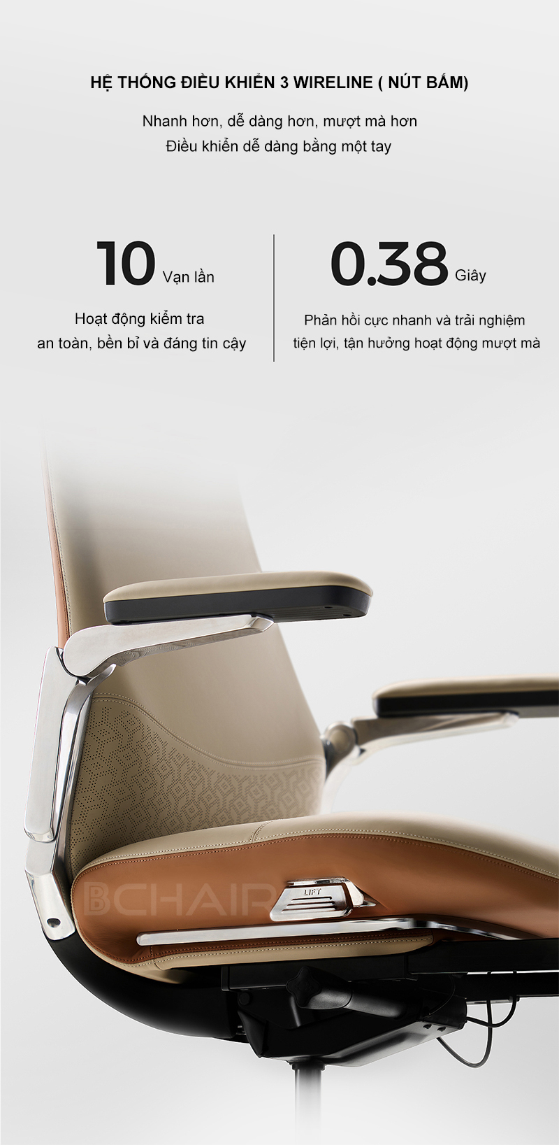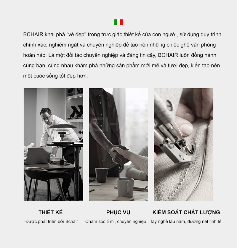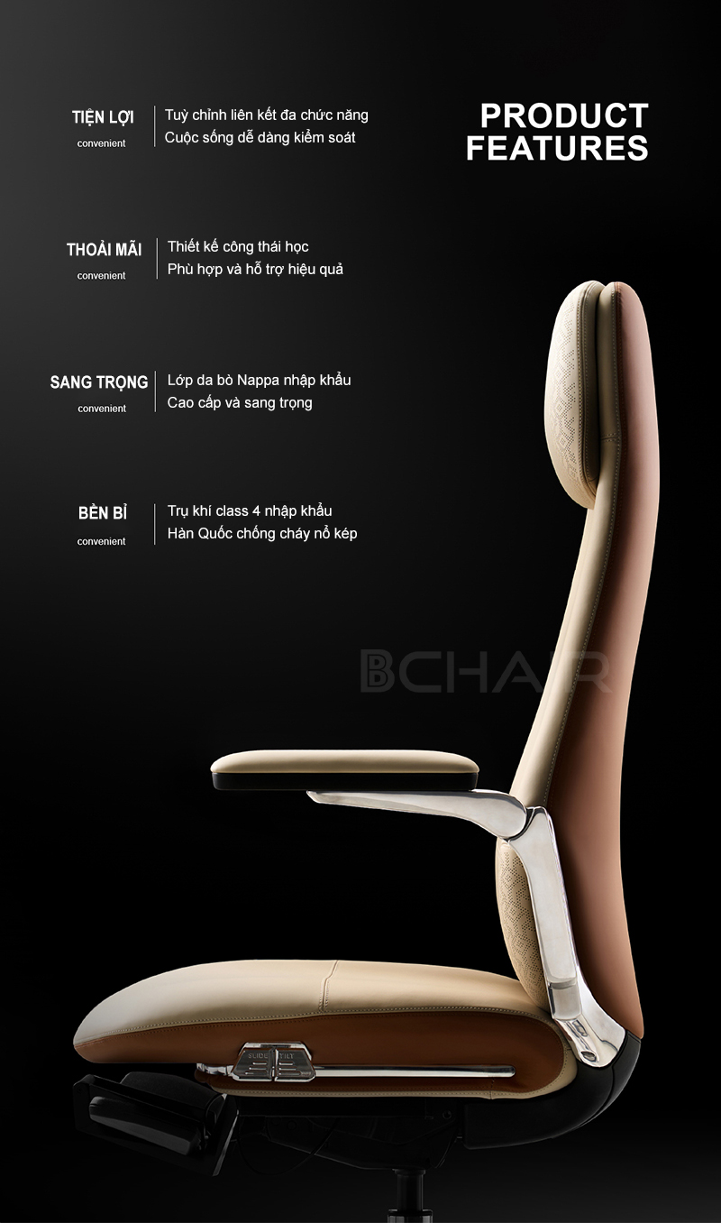 Sản phẩm đẹp lứm, nhiều tính năng hiện đại, chất liệu da ngồi mát và mềm đẹp, ghế bchair tạo không gian làm việc sang trọng