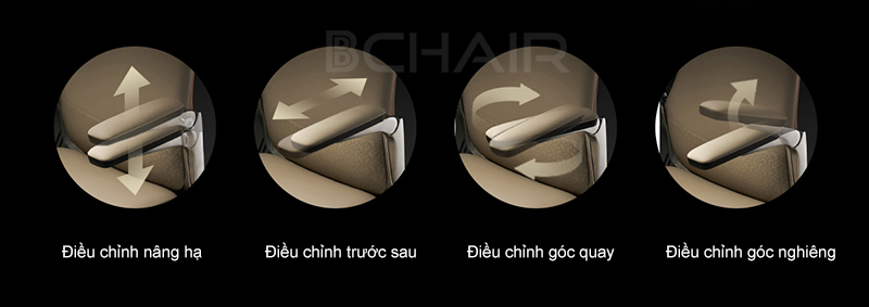 - Tay vịn nhôm đúc 6D: Điều chỉnh nâng/hạ độ cao, trượt tiến/lùi, xoay trái/phải, lật lên/xuống