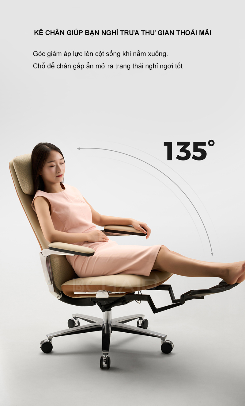 Ghế cho phép điều chỉnh độ nghiêng tựa lưng lên đến 135 độ, đồng thời có cơ chế khóa ở mọi vị trí. Điều này mang đến sự linh hoạt khi chuyển đổi giữa tư thế làm việc và thư giãn.