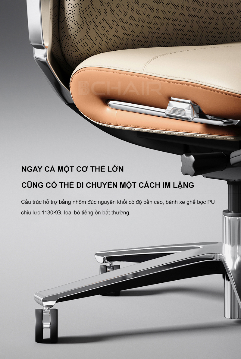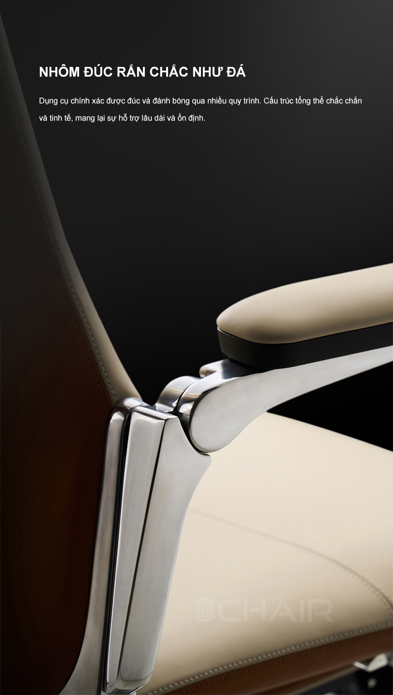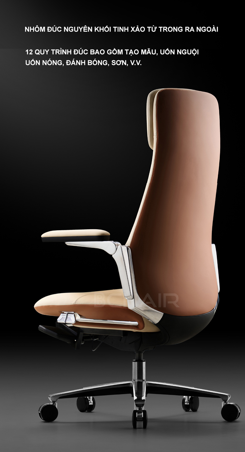 Cơ sở của ghế được trang bị đế nhôm đúc nguyên khối đánh bóng, đạt tiêu chuẩn 5 sao về độ bền và khả năng chịu lực.
