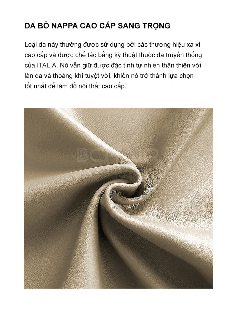 - Da bò Nappa cao cấp nhập khẩu từ Italia được bọc ở mặt trước và tựa tay, mặt sau ghế sử dụng da PU cao cấp.