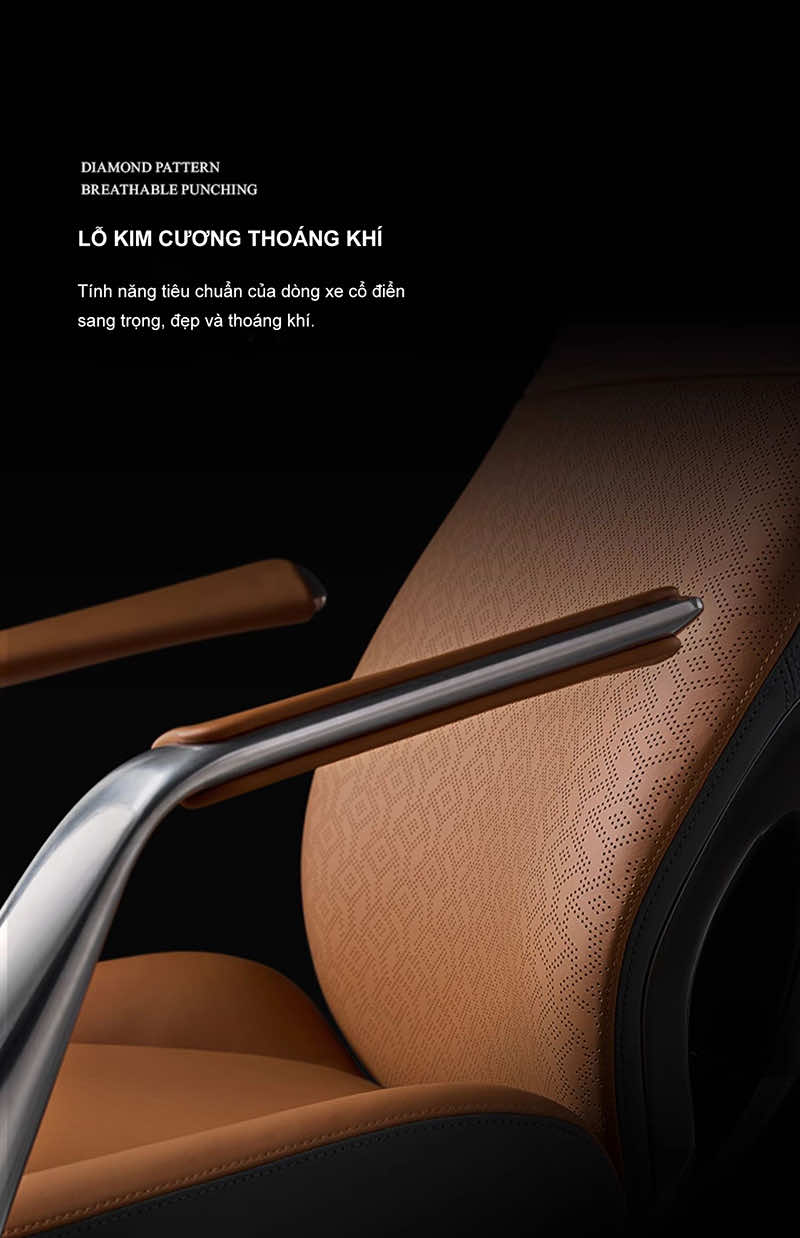 - Tựa tay thiết kế nhôm đúc nguyên khối, bề mặt phủ da bò Nappa cao cấp nhập khẩu từ Italia mềm mại
