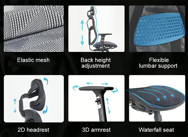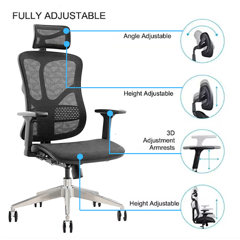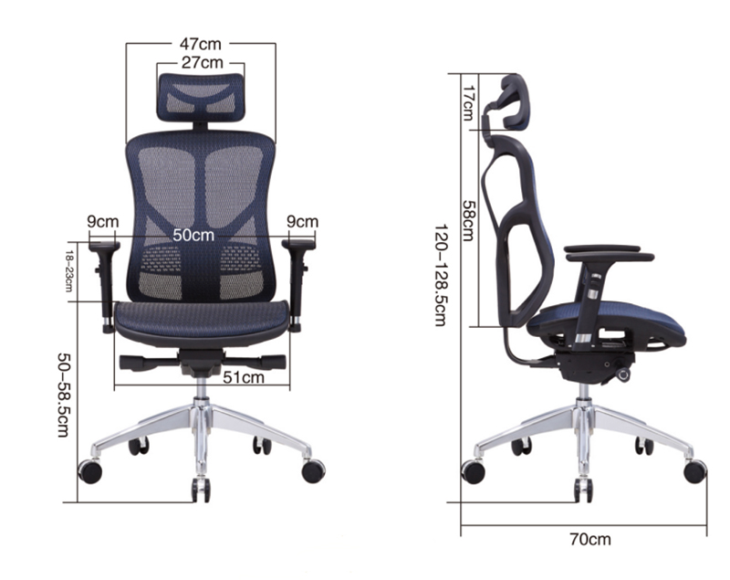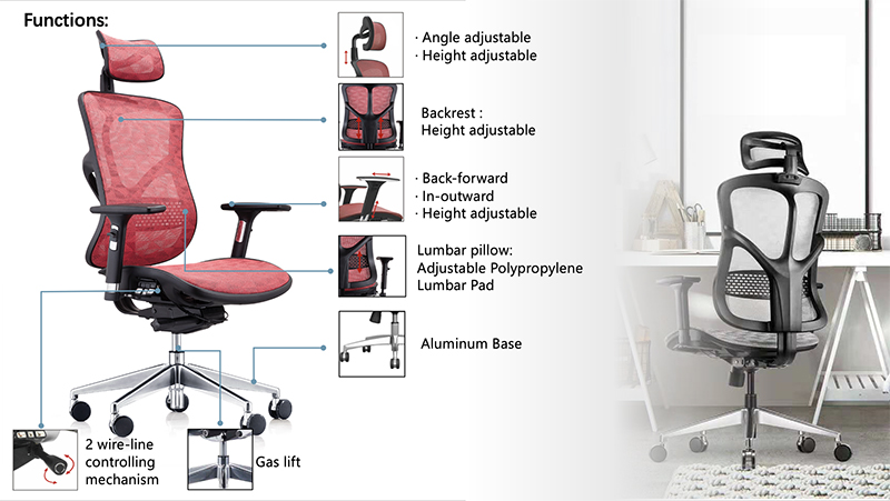 – Tựa lưng: điều chỉnh độ cao – Hỗ trợ thắt lưng linh hoạt – Tay vịn 3D: điều chỉnh độ cao/độ sâu/xoay – Điều chỉnh ghế: độ cao/nghiêng lưng (90°~130°) ở 3 vị trí có khóa – Núm điều chỉnh độ căng nghiêng – Bánh xe PU 65mm không gây tiếng ồn xoay 360° |