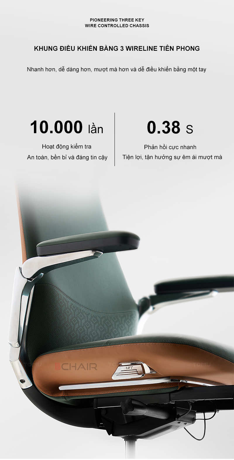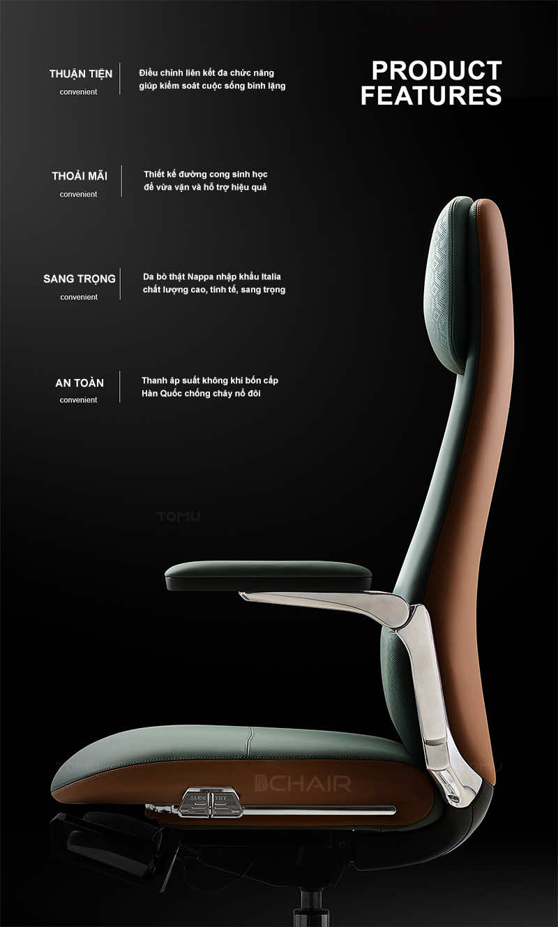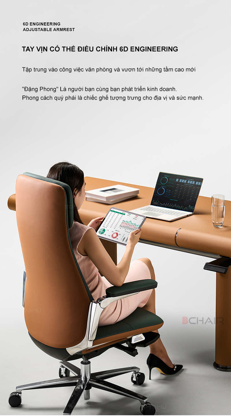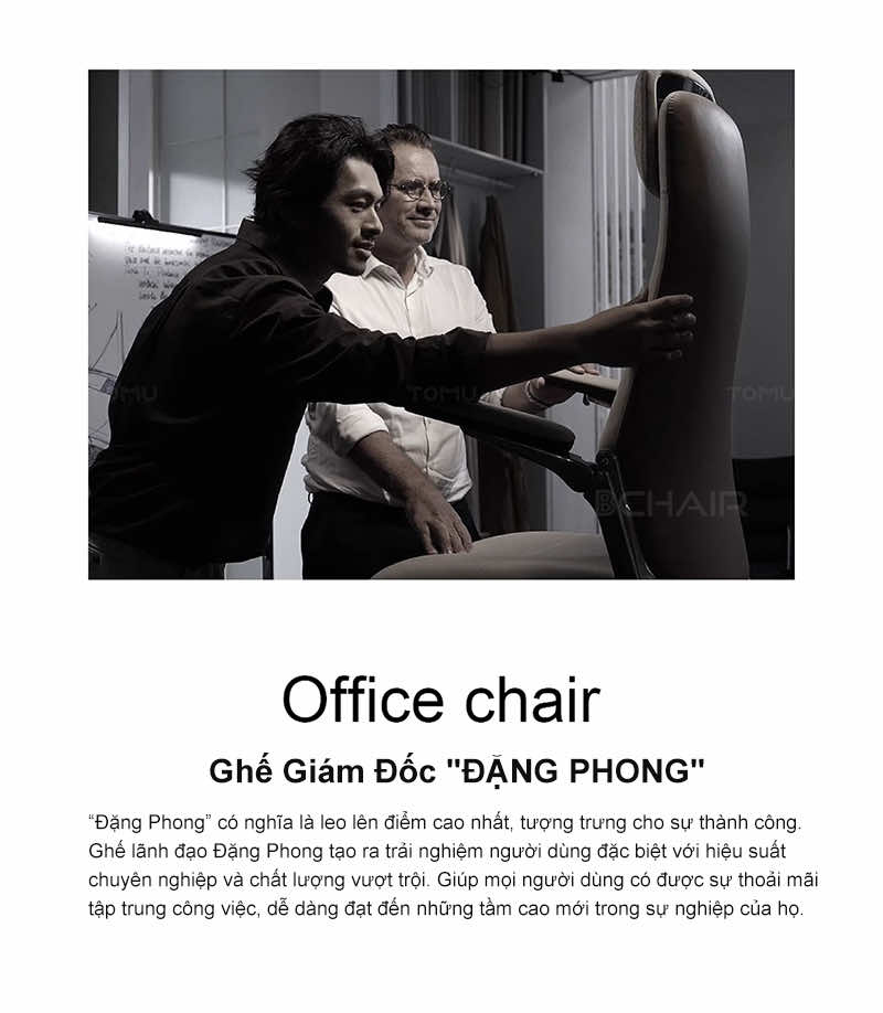 | Thiết kế sang trọng, đẳng cấp | Ghế giám đốc Bchair có kiểu dáng hiện đại, đường nét tinh tế, chất liệu cao cấp, mang đến vẻ đẹp sang trọng và chuyên nghiệp cho không gian làm việc. | Tạo ấn tượng mạnh mẽ, thể hiện vị thế và đẳng cấp của người lãnh đạo. |