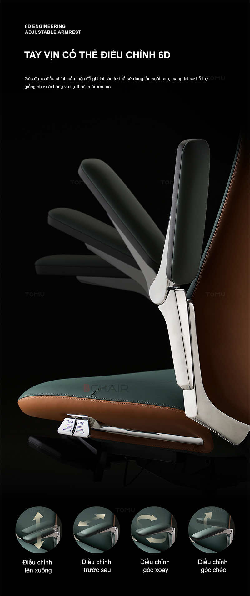 | Công thái học vượt trội | Ghế được thiết kế dựa trên nghiên cứu về cơ thể người, hỗ trợ đường cong tự nhiên của cột sống, giảm áp lực lên các vùng nhạy cảm. | Giảm đau mỏi lưng, cổ, vai gáy, nâng cao sức khỏe và sự tập trung khi làm việc. |